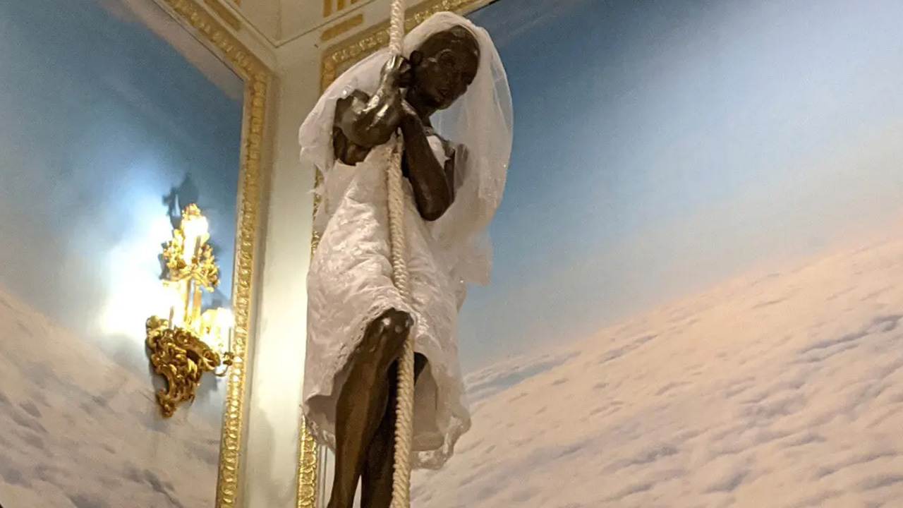 Jednym z najbardziej niepokojących elementów rezydencji była rzeźba przedstawiająca pannę młodą trzymającą się liny, ustawiona w centralnym atrium. Symbolika jest oczywista – panna młoda, symbolizująca niewinność i dziewictwo, próbuje uciec przed czymś strasznym… być może przed samym właścicielem domu, czyli przed starym pedofilem.