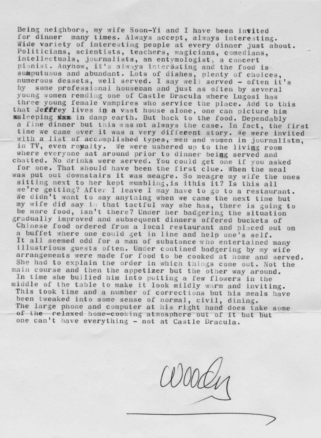 rezydencji Epsteina znaleziono również list Woody’ego Allena, napisany z okazji jego 63. urodzin. Allen – sam oskarżany o molestowanie dzieci – wielokrotnie porównywał dom Epsteina do „Zamku Draculi”. Opisywał kolacje, na których posiłki serwowały „młode kobiety przypominające wampirzyce z filmu Lugosiego”.